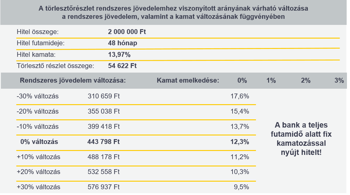 Éves ügyleti kamat: 13,97%-tól 26,45%-ig. (THM: 14,90%-tól 29,90%-ig) Kezelési díj: 0 Ft. Futamidő: 10, 12, 15, 18, 20, 24, 30, 36 vagy 48 hónap. Az igényelhető hitelösszeg: 50 000 Ft-tól 2 000 000 Ft-ig terjedhet. Önrész, nem kötelező, de az ügyfél választása és / vagy a hitelbírálat eredménye szerint változhat.