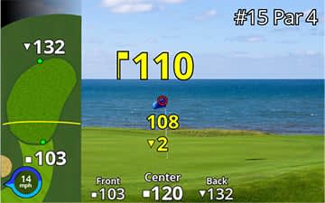 A térképrétegek megmutatják a lyuk elrendezését, így látod a távolságot a zöld elejéhez, közepéhez és hátuljához.