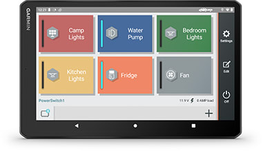 Párosítsd a Garmin PowerSwitch™ digitális kapcsolódobozzal (külön megvásárolható), hogy egyszerűen vezérelhesd járműved 12‑voltos elektronikáit, például a lámpákat, ventilátorokat és egyebeket.