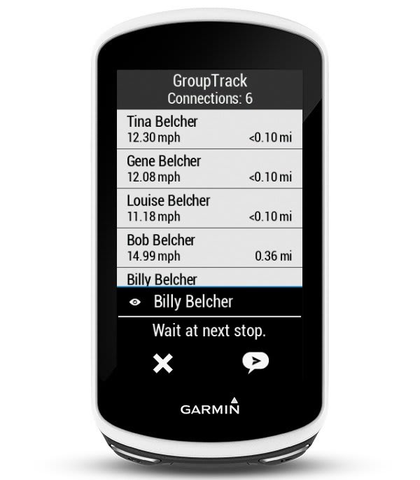 Nem kell elővenned a telefont vagy aggódnod a többiek miatt, ha elhúznak vagy lemaradnak. A kerékpáros-kerékpáros üzenetküldés lehetővé teszi, hogy előre megírt üzeneteket küldj az Edge 1030-ról az ő Edge-jükre. Tudasd a barátaiddal, ha pár perc múlva utolérsz, vagy ha menjenek nélküled tovább. Ha defekted van vagy segítségre van szükséged, üzenetet küldhetsz a GroupTrack3-hoz párosított kerékpárosoknak, hogy megtaláljanak.