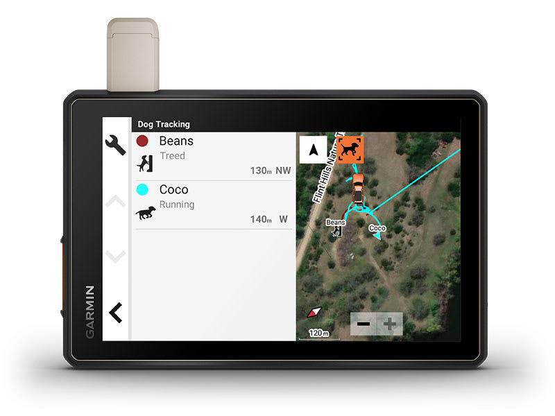 Vezeték nélküli párosítással kötheted össze a Tread motorsport navigációt kiválasztott Garmin GPS kutyakövetőkkel (külön vásárolható), hogy segítsen megtalálni és visszahozni a vadászkutyáidat a terepen. A tartományon belüli minden kutyához jelölőt látsz, amely közvetlenül a navigációs készülék térképén jelenik meg.