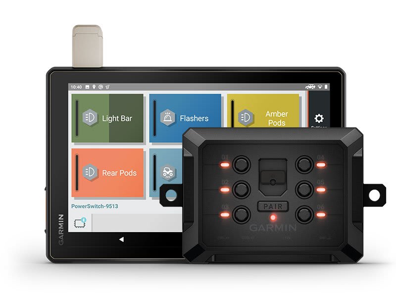 Párosítsd a Tread powersport navigációt a kompatibilis Garmin PowerSwitch™ digitális kapcsolódobozzal (külön kapható), hogy a jármű 12 voltos elektromos rendszereinek — például fényhidak, differenciálzárak és egyebek — vezérlését a képernyőről tudd irányítani.