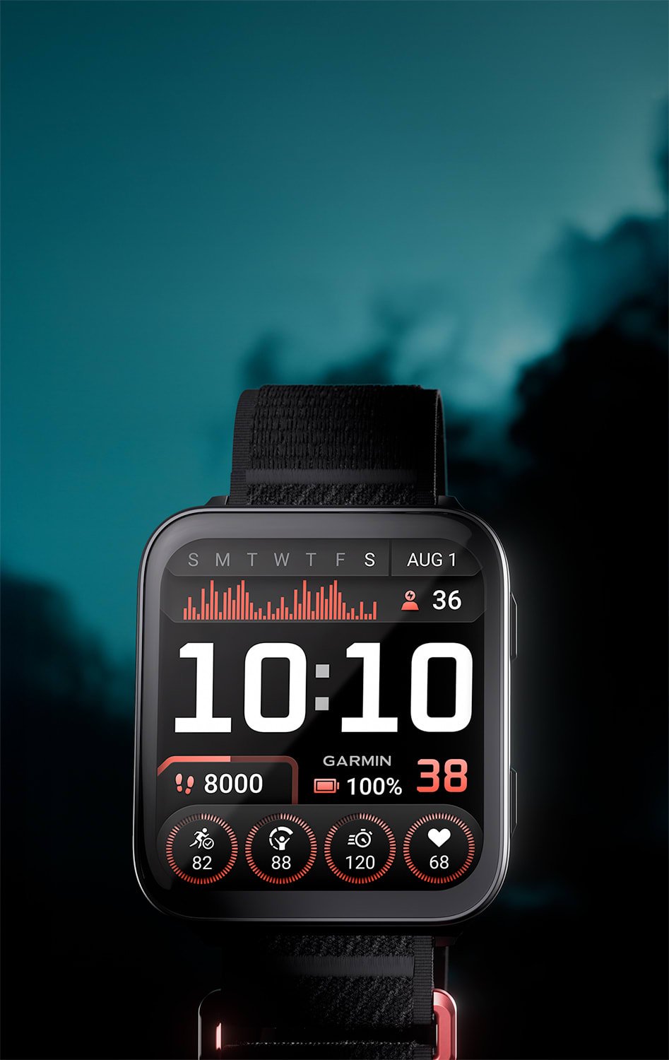 A legnagyobb, 2″-os AMOLED kijelzőn jelennek meg az adatok, karcálló zafírüveggel. A könnyű titán hátlap, a karcsú dizájn és a kényelmes illeszkedésű nejlon szíj egész napos viseletet biztosít.